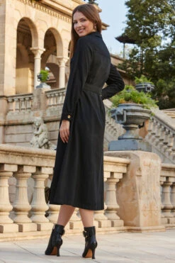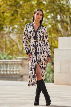 Black Boucle Luxe Belted Pencil Dress With Gold Chain Detail